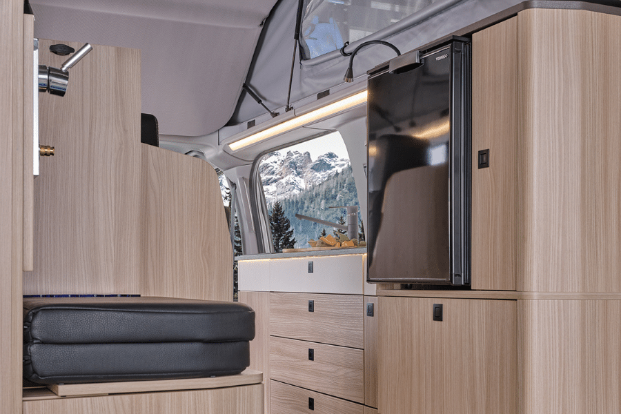 Avec son confort haut de gamme et sa boîte automatique, ce van aménagé est parfait pour partir à l’aventure sans compromis. 4 places assises, 4 couchages, une cuisine équipée, un chauffage stationnaire et un toit relevable pour plus d’espace… Tout est pensé pour que votre escapade soit aussi libre que confortable!